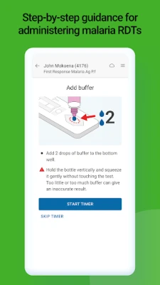 - RDT Administration: Easily conduct malaria RDT testing, interpret results, and document treatment or triage decisions with guided workflows.